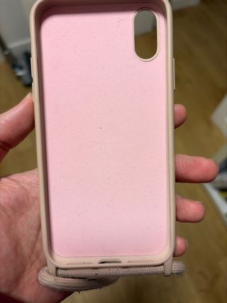 Funda protectora para iPhone XS o XR en color rosa. Incluye una cuerda para llevarla cómodamente. - Interior forrado en suave tejido. - Diseño con abertura para cámara.