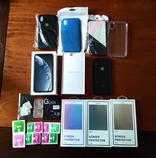 Iphone Xr 128Gb Negro en muy buen estado con su caja original, con 4 fundas del móvil, 3 cristales templados, toallitas para limpiarlo, cristales protectores para la cámara de regalo. Como aparece en las fotos, está incluido su protector de cristal puesto, tanto por delante como por detrás para mayor protección. Todo original, nada cambiado. Pregunta sin compromiso, si necesitas número de serie, modelo, o cualquier detalle. (Algo negociable).