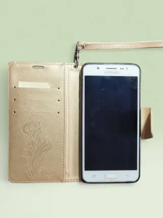 Teléfono Samsung J5 (2016) en color blanco. Incluye funda protectora, sin cargador, folletos y caja original. Libre. - Funda tipo libro con compartimentos en color dorado con correa de muñeca, diseño con relieve de mariposa y flores en la funda.