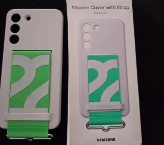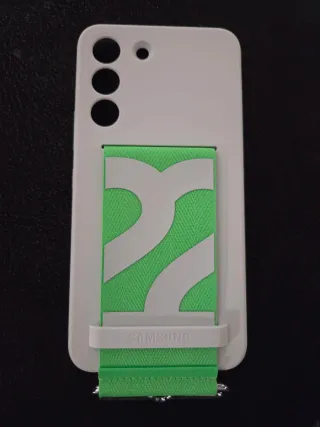 Funda original para Samsung S22 con un diseño moderno y práctico. SIN USAR. - Color blanco. - Correa verde con diseño. - Logo de Samsung en la correa.