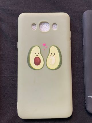 Lote de tres carcasas para teléfonos Samsung Galaxy J5 - Carcasa plateada con soporte. - Carcasa verde con diseño de aguacates. - Carcasa negra con diseño de astronauta y luna. Usada muy muy poco la gris.