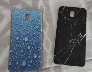 Dos fundas para móvil Samsung J5 con diseños originales. - Funda con diseño de gotas de agua. - Funda con diseño de mármol negro.