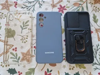 Conjunto de tres fundas para el Samsung A54. - Funda transparente Spigen. - Funda de silicona gris Samsung. - Funda negra con tapa para cámara y anillo. Vendo el lote por 5€. Están usadas pero en perfecto estado