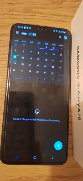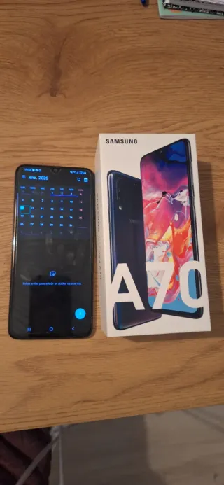 Teléfono móvil Samsung Galaxy A70 en color negro. - Pantalla grande. - Buenas fotografias - Diseño elegante en color negro, siempre usado con carcass Usado siempre con protección de pantalla y funda. No se aprecia ningun daño. Es la caja y el telefono.
