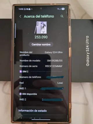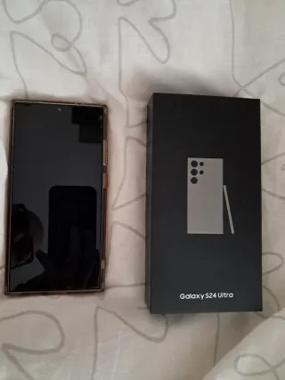 Teléfono móvil Samsung Galaxy S24 Ultra con 512GB de almacenamiento. El cristal protector tiene varios picotazos mostrados en las fotos, NO en la pantalla. Viene con su caja, factura para la garancia, y funda de regalo.