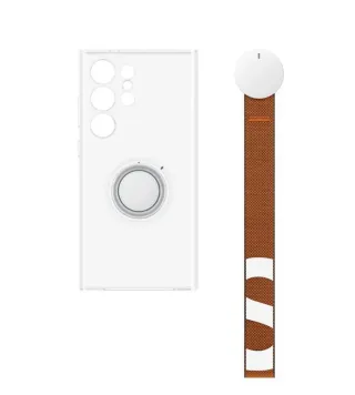 Funda transparente original para Samsung S24. Protege tu dispositivo con estilo. - Diseño claro que muestra el color original del teléfono. - Incluye accesorio de agarre circular. - Correa de sujeción de tela marrón con diseño.