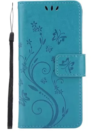 Funda tipo cartera para Samsung S21 5G. Presenta un diseño floral con mariposas grabadas y un cierre de imán. - Diseño con flores y mariposas. - Cierre de imán - Incluye ranuras para tarjetas y compartimento para billetes. - Correa de muñeca a juego.