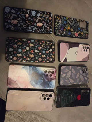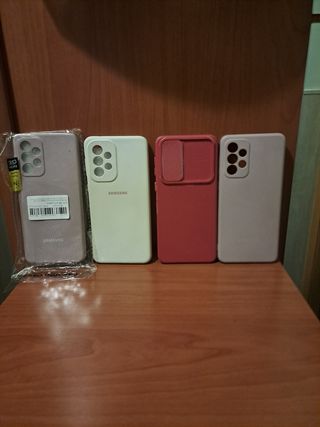 Conjunto de cuatro fundas para el modelo Samsung A33. - Funda rosa claro con acabado mate. - Funda beige con acabado mate. - Funda roja con tapa deslizante para cámara. - Funda rosa pálido con acabado mate. Las 4 fundas están bastante usadas aunque dos de ellas están en mejor estado que las otras.