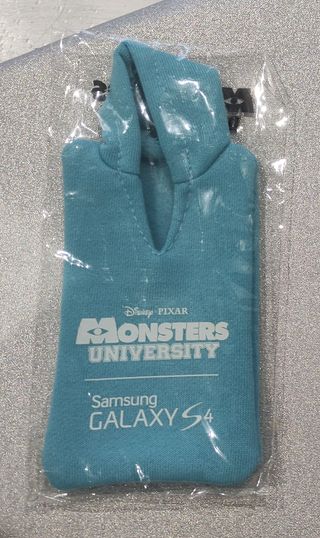 Funda para móvil de Samsung en colaboración con Pixar para la película Monsters university. Color azul claro. Tejido como el de las sudaderas, de hecho la funda tiene capucha. Está nueva, sin abrir. Medidas: 14x8,3cm (sin contar la capucha)