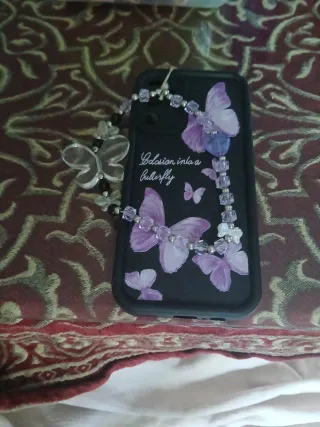 Funda para móvil con un bonito estampado de mariposas moradas. - Diseño con mariposas en tonos morados. - Abalorios y colgante de mariposa. - Compatible con Samsung A14.