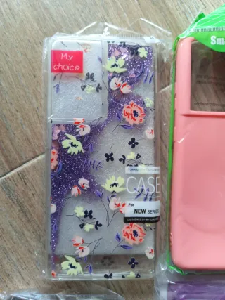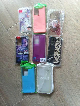 Lote de fundas para Samsung S21 Ultra. Incluye varios diseños y colores.todas por 5€ - Funda rosa lisa. - Funda transparente con purpurina y soporte. - Funda morada brillante. - Funda negra con estampado de leopardo. - Funda azul lisa. - Funda transparente con cadena. - Funda con diseño de Chucky.