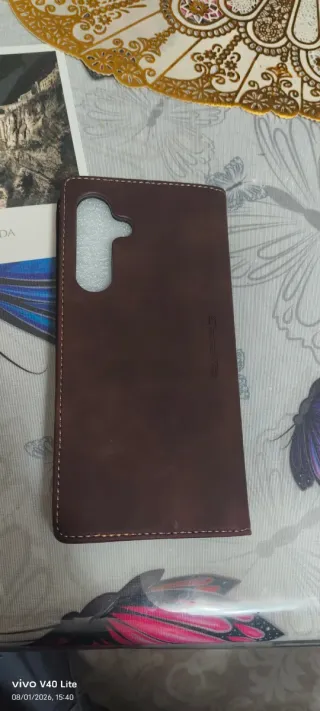 Funda de estilo libro en color marrón para Samsung S24 FE. Precio unitario - Material: Piel sintética. - Cierre magnético. - Compartimentos interiores para tarjetas.