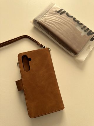 Funda tipo cartera para Samsung Galaxy A54 en color marrón. Fabricada en material similar al ante, con cierre de botón y ranuras para tarjetas y monedero - Incluye monedero. - Correa de muñeca desmontable. - Diseño elegante y funcional.