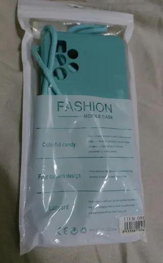 Funda de móvil para Samsung A52, nueva sin estrenar (sólo probada una vez) con un diseño moderno y práctico. - Color azul turquesa. - Material resistente y suave al tacto. - Diseño de cuatro esquinas reforzadas. - Incluye cordón para llevarla colgada.