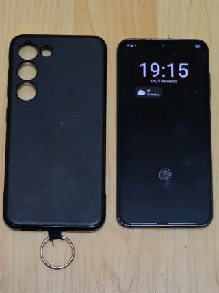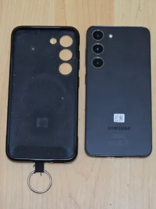 Teléfono móvil Samsung S23 con 256GB de almacenamiento en color negro. Incluye funda protectora. - Funda negra con anilla. - Diseño con huecos para las cámaras. - Protector de pantalla. -el arañazo inferior de la pantalla es el protector. La pantalla está como nueva.