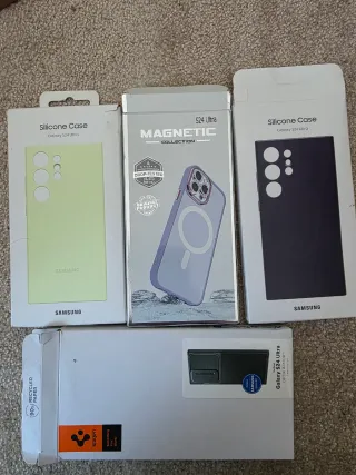 2 fundas Samsung, una funda spigen y otra de 3 marca todas en su caja bien cuidadas.Se venden todas juntas
