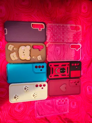 Lote de fundas para Samsung Galaxy A55 5G. - Funda morada. - Funda transparente con diseño de ondas y puntos blancos. - Funda marrón con ositos. - Funda transparente con diseño de ondas rosas. - Funda azul. - Funda negra y roja con soporte. - Funda blanca con huellas. - Funda rosa con corazón. - Funda transparente.