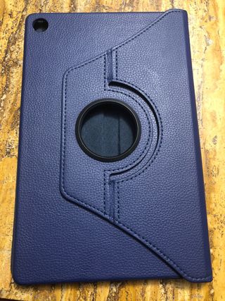 Funda compatible con tablet de lenovo m10 de 10.61 pulgadas. Es azul marino de piel y puede girarse la parte de la tablet.