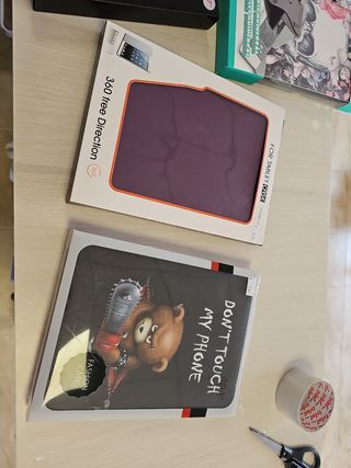 Funda giratoria de color morada de 9.7 pulgadas para tablet o iPad a estrenar sin usar. La vendo porque la pedí de color negro, regalo lápiz táctil.
