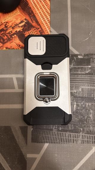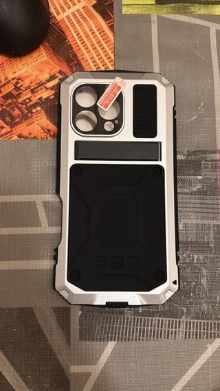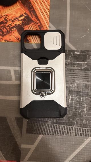 Funda para iPhone 13 en buen estado. Ofrece una buena protección para tu dispositivo. - Diseño robusto. - Acabado plateado y negro.