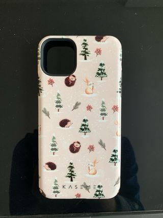 Funda para iPhone con un adorable diseño invernal de animales y árboles. - Estampado de erizos, conejos y pinos nevados. - Base en tono rosa pálido. - Marca KaseMe.