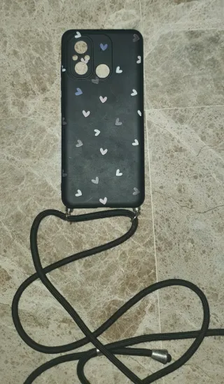 Funda para móvil Redmi 12c con un diseño moderno y práctico. - Color negro con estampado de corazones. - Incluye cuerda ajustable para llevar colgada. - Protege tu dispositivo con estilo.