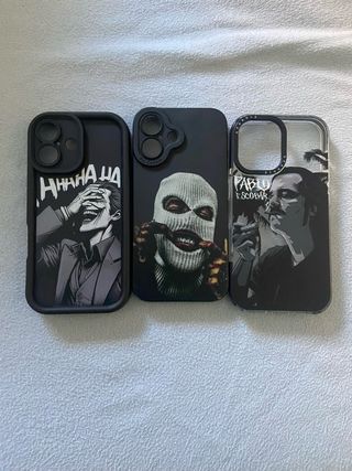 Conjunto de tres fundas para iPhone con diseños llamativos. - Diseño de Joker riendo. - Diseño de persona con pasamontañas. - Diseño de Pablo Escobar.