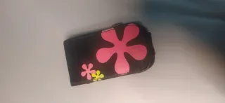 Funda para móvil con tapa y un diseño alegre de flores. - Base negra. - Flores grandes en color rosa. - Flores pequeñas en color amarillo.