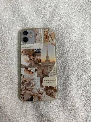 Funda para iPhone 11 con un diseño collage inspirado en París. - Estampado con imágenes de la Torre Eiffel y elementos vintage. - Diseño dream on little dreamer y I'm not quitting it. - Incluye un sello Parental Advisory como detalle gráfico.