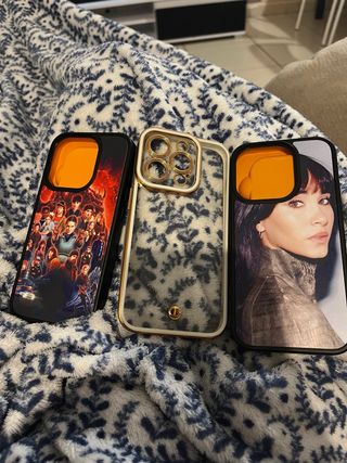 Tres fundas para iPhone 15 Pro, todas nuevas. - Funda con diseño de personajes de Stranger Things. - Funda transparente con estampado y detalles dorados. - Funda con imagen de una mujer.