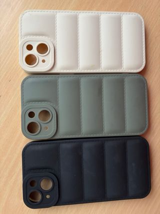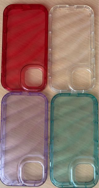Set de 4 fundas para iPhone 13, 14 o 15. Incluye fundas en color rojo, transparente, morado y verde. - Material transparente y flexible. - Diseño que cubre los bordes del teléfono. - Recorte para la cámara. Vendo cada una por 2€, se puede elegir.