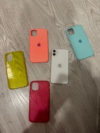 Se vende iPhone 11 en color blanco junto con cuatro fundas. - Dos de las fundas son de la marca Apple. - Incluye una funda de color rosa. - Incluye una funda de color turquesa. - Incluye una funda de color amarillo. - Incluye una funda de color rojo. ESTE MOVIL NO PRESENTA NINGUN DEFECTO DE SISTEMA. Con 86% de salud de batería, para mas detalles ( fotos o videos de su estado), consúltame. Precio negociable.