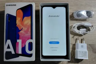 Teléfono Samsung Galaxy A10 azul. Smartphone RAM: 2 GB Ranura para tarjeta SIM Sistema operativo: Android Tamaño de pantalla: 6.2 pulgadas Capacidad de almacenamiento: 32 GB Funciona perfectamente. Con la caja original y todos los accesorios: cargador original Samsung, cable, auriculares sin usar y extractor de tarjeta SIM. Libro de instrucciones. Se regala funda.