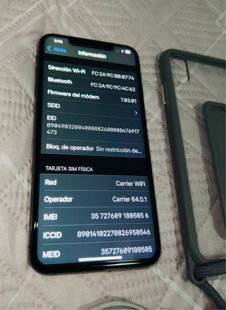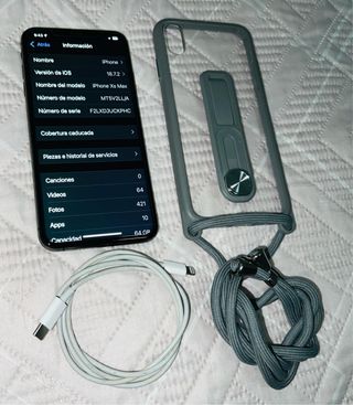 iPhone Xs Max con acabado en gris espacial y 64 GB de almacenamiento. - Modelo: iPhone Xs Max - Capacidad: 64 GB - Color: Gris espacial - Versión de iOS: 18.7.2 - Incluye cable de carga y funda protectora con soporte y cordón.