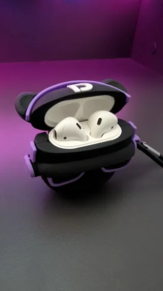 Funda protectora para AirPods 1ª y 2ª generación con un diseño divertido. - Color negro con detalles en morado. - Diseño de Bulldog con gorra, gafas y cascos. - Nuevo a estrenar.