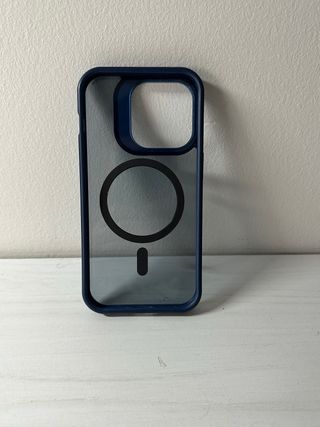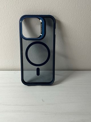 Funda protectora para iPhone 14 Pro con sistema Magsafe. - Diseño transparente con borde azul. - Incorpora el anillo magnético para accesorios Magsafe.