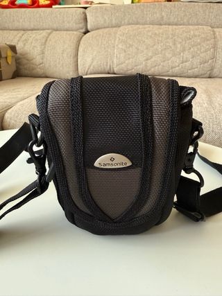 Funda protectora de la marca Samsonite, ideal para cámaras pequeñas o accesorios. - Color negro y gris. - Material textil resistente. - Correa ajustable para colgar.