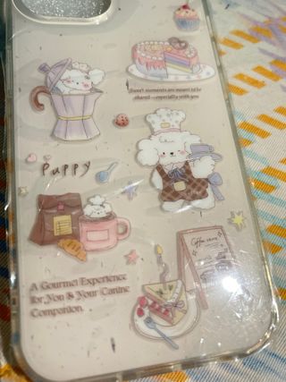 Funda protectora para iPhone 15 con un adorable diseño. - Ilustraciones de cachorros y dulces. - Estilo kawaii y divertido.