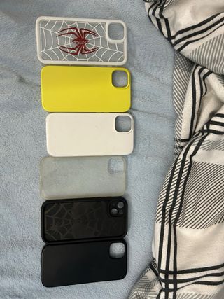 Variedad de fundas para Iphone 14 Plus. Diseños y colores para proteger tu dispositivo. - Funda transparente con diseño de telaraña y araña roja. - Funda amarilla lisa. - Funda blanca lisa. - Funda transparente mate. - Funda negra con diseño de telaraña y arañas. - Funda negra lisa. cada una vale 3 euros