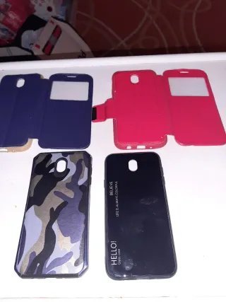 Lote de 4 accesorios para Samsung J7, incluye dos fundas tipo libro y dos carcasas traseras. Vendo las 4 ( 12 €) o de 2 en 2 (8 €). - Fundas tipo libro en color azul y rojo, con ventana. - Carcasas traseras, una con diseño de camuflaje y otra negra con texto. Hago envíos por Wallapop