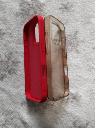 Dos fundas para iPhone 16 Pro roja y otra transparente. - Funda roja de silicona. - Funda transparente de plástico.