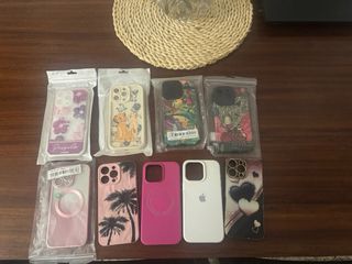 Lote de fundas para iPhone 15 Pro Max, algunas nuevas y otras seminuevas. - Funda rosa lisa con MagSafe. - Funda beige con diseño de El Rey León. - Funda con diseño de selva y personajes. - Funda rosa con palmeras. - Funda con diseño de corazones y detalles dorados. - Funda blanca lisa con logo de Apple. - Funda con diseño de leopardo y flores. - Funda blanca lisa con logo de Apple.