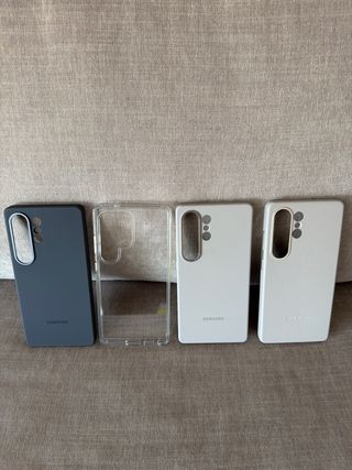 Conjunto de fundas para el Samsung Galaxy S25 Ultra. Todas oficiales excepto la transparente. - Funda de silicona gris oscura. - Funda transparente. - Funda gris clara. - Funda gris texturizada. *Precio por unidad 15€.