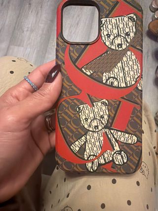 Funda para iPhone 12 Pro Max con un diseño distintivo. - Estampado de osos y logo CH. - Colores marrón, rojo y blanco.