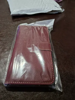 Funda tipo cartera en color burdeos para un teléfono móvil plegable. Tiene una correa de mano para facilitar su transporte. - Material: Símil piel. - Color: Burdeos. - Incluye correa de mano.