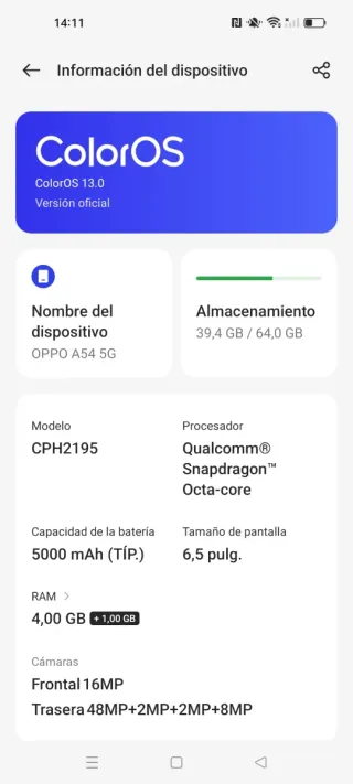 Teléfono móvil Oppo A54 5G con 64 GB de almacenamiento. - Pantalla de 6,5 pulgadas. - Batería de 5000 mAh. - Procesador Qualcomm Snapdragon Octa-core. - Cámara frontal de 16MP. - Cámaras traseras de 48MP+2MP+2MP+8MP. - RAM de 4,00 GB con 1,00 GB adicional. Ningún defecto estético, siempre con protector y funda. Está perfecto. No entrego cargador, solo móvil.
