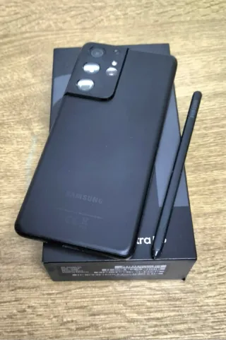 Teléfono móvil Samsung S21 Ultra 5G en color negro. Incluye S Pen. - Siempre con funda y protector - Sin rallones ni golpes - 256 GB de almacenamiento interno. - 12 GB de memoria RAM. - 6 Fundas protectoras incluidas dos originales. - 2 Protectores de pantalla EGV.
