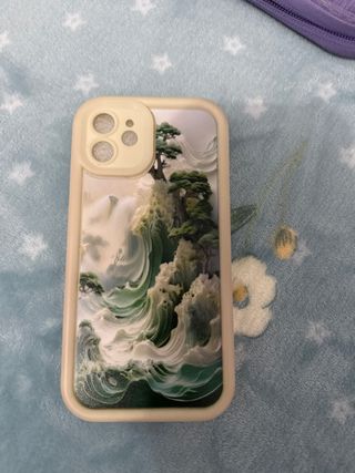 Funda para iPhone 12 con un diseño artístico de montañas y olas. - Estampado detallado de paisaje natural. - Marco protector de color crema.