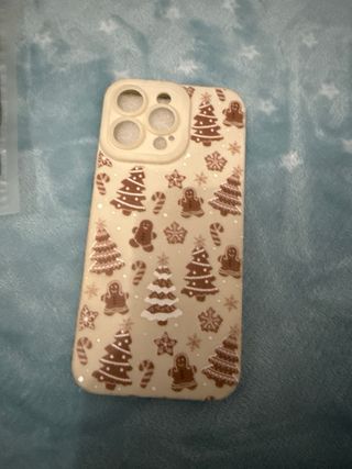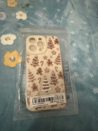 Funda para iPhone 16 Pro Max con diseño navideño. - Estampado de árboles de Navidad, galletas de jengibre y bastones de caramelo. - Color base beige. - Fabricada en China.