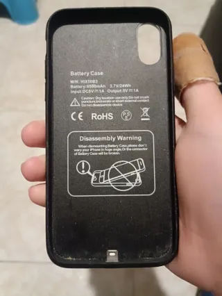 Funda tipo batería externa para móvil aiphon xs con gran capacidad. Funciona le hace falta solo cargar - Capacidad de 6500mAh. - Voltaje de salida 5V/1A. - Advertencia de desmontaje incluida.